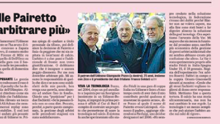 Viva la tecnologia Pozzo, nel 2004, dopo un gol annullato a Iaquinta per un fuorigioco inesistente in un Udinese-Bologna, si impegnò in prima persona è affidò al Cnr di Bari il compito di costruire un progetto che permettesse di usare la tecnologia nel calcio. Il sistema fu anche sperimentato allo stadio Friuli in una gara di coppa Italia tra Udinese e Inter.«A suo tempo credo di aver dato il mio contributo perché qualcosa si muovesse in questo senso», dice Pozzo al quale il nome di Pairetto evoca Calciopoli. «Conosco il padre», aggiunge riferendosi a Pierluigi, uno dei due designatori nel 2006. «Ho sempre creduto nella soluzione tecnologica, in federazione c’erano dei dubbi perché Blatter non ne voleva sapere, ma alla fine sono stati bravi a far digerire almeno la soluzione della goal tecnology. Ora aspettiamo l’avvento della Var. Mi auguro che sia messa in funzione dal prossimo anno, sarebbe più economica della gestione di questi arbitri addizionali che mi sembra abbiano creato più confusione che altro». La Var è stata sperimentata proprio allo stadio Friuli in Italia-Spagna Under 19, il 18 gennaio. Regista dell’esperimento l’ex arbitro Rosetti: Fabbri in campo e la coppia Orsato-Giacomelli davanti ai monitor. «Credo che gli stessi fischietti vogliano togliersi di dosso certe responsabilità. Mettiamo fine a questa tortura. Il calcio ha una storia ultracentenaria, ma non ha mai cambiato le sue regole. La tecnologia è un mezzo semplice che può aiutare l’arbitro anche sui calci di rigore».