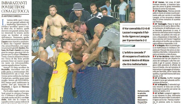 "Una sera maledetta. Delneri smazza il suo solito 4-4-2 mobile, o meglio immobile per le condizioni fisiche di Thereau che ondeggia la cresta partendo alle spalle di Lasagna. La partenza bianconera è piatta, capace soltanto di raccogliere calci d’angolo che poi non riesce a sfruttare neppure con una superiorità fisica evidente, visto che sulla fascia destra c’è un centrale difensivo, Angella, e non il nuovo arrivato Larsen. Il nodo è che neppure gli altri sembrano in grado di reggere il copione, per un motivo o per un altro. Prendete il centrocampo: con Fofana regista e Hallfredsson a fargli da guardia del corpo è improponibile. E gli esterni alti? De Paul almeno cerca di saltare l’uomo, ma poi non trova mai uno sbocco degno di nota, mentre sull’altro fronte è addirittura deleterio, per l’incapacità di scegliere il tempo dell’inserimento sulla fascia. Si arriva così al minuto numero 26 della ripresa con la tifoseria friulana delusa (come si comprende dai cori) e la truppa bianconera sotto di due gol per un diagonale di Borriello (fortunato nel ritrovarsi sul destro il pallone del vantaggio, al 25’) e per una rete di Lazzari, arrivata al 54’grazie alla Var. Lì l’Udinese piazza l’acuto e trasforma in oro un corner con colpo di testa di Nuytinck per poi cercare di uscire dall’inferno con una assetto diverso. Con Barak al centro della mediana in un 4-3-3 con De Paul e Jakto ai fianchi e con un tridente composto da Thereau, Perica e Lasagna in attacco. E la mossa disperata paga. L’Udinese comincia a macinare gioco azione dopo azione fino a quando un traversone dalla destra arriva a Lasagna che viene agganciato da Vaisanen. Valeri prima sorvola, poi torna sulle proprie convinzioni grazie al Var: rigore che Thereau trasforma per il 2-2. L’assalto finale con sette minuti di recupero viene diviso a metà, ma la Spal ha il magico destro di Rizzo in canna.