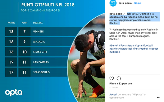 Nel 2018, l'Udinese è la squadra che ha raccolto meno punti (7) nei cinque maggiori campionati europei. Blackout.