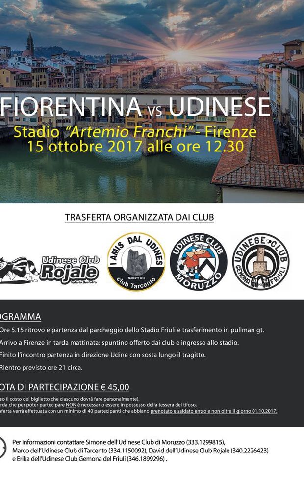 Weekend senza campionato per i team di Serie A, ma i tifosi dell'Udinese già scalpitano per la gaara all'Artemio Franchi. Domenica 15 ottobre alle 12.30, infatti, i bianconeri scenderanno in campo a Firenze contro la formazione di Stefano Pioli per l'ottava giornata del girone di andata. Sono tre i club affiliati all'Associazione Udinese Club che hanno deciso di organizzare la trasferta. Nello specifico si tratta di Fagagna (che organizza una gita di due giorni, vedi locandina in basso a destra), di Paularo (anche in questo caso previsto un weekend toscano) e dei club Tarcento-Reana-Moruzzo-Gemona, che hanno allestito la trasferta in giornata in sinergia (vedi locandina in basso a sinistra).