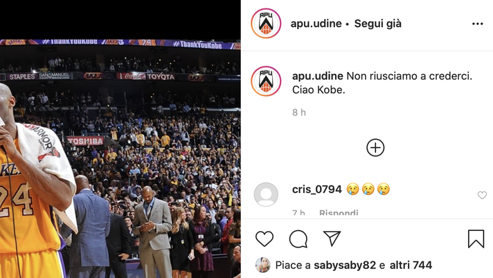 Non riusciamo a crederci. Ciao Kobe. Così l'Apu Udine commenta la tragica fine della Leggenda