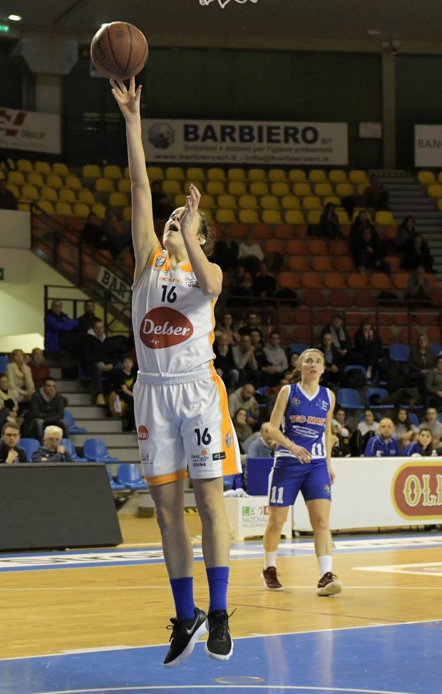 Non è bastata una prova di carattere alla Delser Udine per interrompere la striscia di quattro sconfitte consecutive. Nella quarta giornata di ritorno Crema ha espugnato il Carnera per 50-59 al termine di una partita dai mille volti. Dopo aver raggiunto un cospicuo vantaggio nel primo quarto (18-10), Udine è scivolata fino al -13 (19-32) per poi ritornare in partita nel terzo quarto con un contro break di 12-0; ma sul +7 (48-41) la Tec-Mar, trascinata da Capoferri, ha ripreso le redini del match in mano, recuperando lo svantaggio e raggiungendo il +9 finale con un parziale di 2-18. Ora testa ad Alpo: anche la partita di sabato prossimo sarà una vera e propria battaglia.