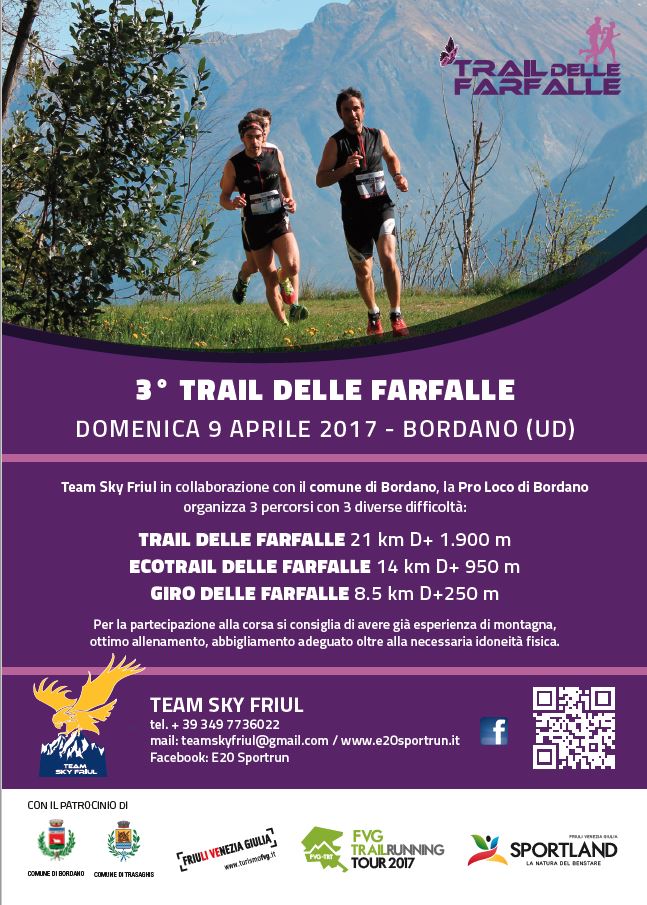 L’Asd Team Sky Friul in collaborazione con il Comune di Bordano, la Pro Loco e il Gruppo Alpini organizza per domani la terza edizione del "Trail delle farfalle", un immancabile appuntamento per gli appassionati della corsa non competitiva in montagna e dei Trail. La manifestazione è inserita nel calendario di Sportland, il progetto di promozione turistica del territorio della pedemontana friulana, e prevede un triplice percorso, che si snoderà nel meraviglioso ambiente prealpino dei monti Brancot e San Simeone.