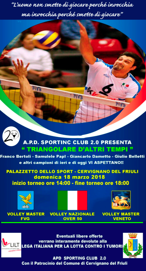 Domenica 18 marzo a partire dalle 14 il Palazzo dello Sport di Cervignano del Friuli (in provincia di Udine) ospiterà il Triangolare d’altri tempi di pallavolo. Organizzato dall’Apd Sporting Club 2.0 di Cervignano, la manifestazione coinvolgerà numerosi ex-atleti azzurri che hanno dato la loro disponibilità a partecipare al torneo.