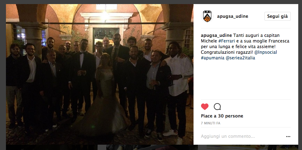 Il 2017 sarà un anno sicuramente da ricordare per Michele Ferrari. Protagonista sul parquet con la casacca della Gsa Udine, della quale è diventato simbolo indiscusso e capitano, l'atleta udinese oggi ha coronato il suo sogno d'amore con la bellissima Francesca Tarocco, osteopata e fidanzata di lungo corso. Il matrimonio della coppia è stato festeggiato in pieno centro, nella splendida cornice della Casa della Contadinanza, alla presenza della società, dello staff tecnico e della squadra bianconeri, all'indomani della prima vittoria stagionale raggiunta ai supplementari contro OraSì Ravenna.