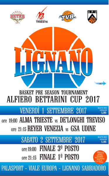 A un mese esatto dall'inizio della stagione - i bianconeri esordiranno sabato 30 settembre al PalaCarnera contro la Fortitudo Bologna -, la Gsa Udine si appresta a vivere un weekend che si preannuncia particolarmente "succoso". Venerdì e sabato, infatti, il palasport di Lignano Sabbiadoro (in viale Europa) ospiterà l'Alfiero Bettarini Cup 2017, prestigioso torneo al quale sono invitate le principali formazioni del NordEst. Oltre all'Apu, infatti, vi prenderanno parte anche i campioni d'Italia della Reyer Venezia, la De Longhi Treviso e l'Alma Trieste. Si comincia venerdì alle 19 con la sfida tra Alma e De Longhi e si proseguirà alle 21.15 con Reyer-Gsa Udine. Il giorno seguente alle 19 si terrà la sfida tra le perdenti della prima giornata e alle 21.15 la finalissima per il Trofeo. E' previsto un biglietto di ingresso giornaliero di 5 euro.