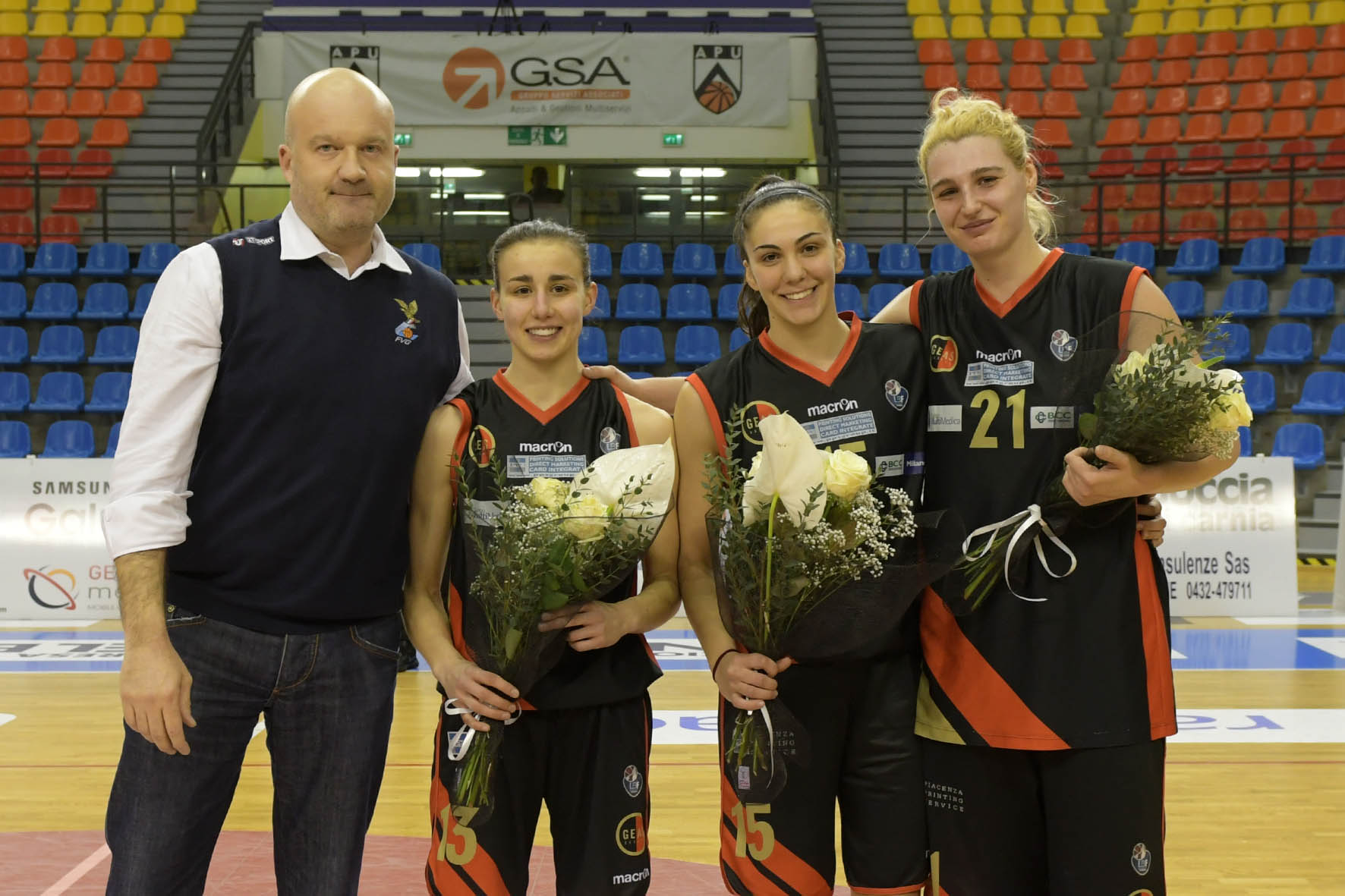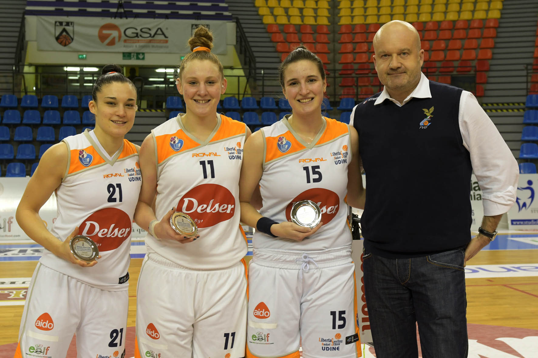 NOTE. Prima dell’inizio del match, terminate la presentazione delle squadre, il presidente della Fip FVG Giovanni Adami ha omaggiato con un mazzo di fiori tre componenti della formazione ospite del Geas: il riconoscimento è andato a Francesca Gambarini, Elisa Ercoli e Beatrice Barberische nel luglio del 2014, a Udine, hanno conquistato la medaglia di bronzo con la nazionale U20 all’Europeo di categoria. Un premio anche per tre giocatrici della Delser – Carlotta Rainis, Vanessa Sturma ed Elisa Pontoni – che alla fine della scorsa stagione hanno conquistato il titolo di vicecampionesse d’Italia alle finali nazionali U20, indossando la maglia del Sistema Rosa Pordenone. E in particolare, l’omaggio ad Elisa Pontoni racchiude in sé anche l’in bocca al lupo di tutto il movimento regionale per la recente convocazione al raduno nazionale U20 che si svolgerà a Pavia dall’11 al 14 febbraio.