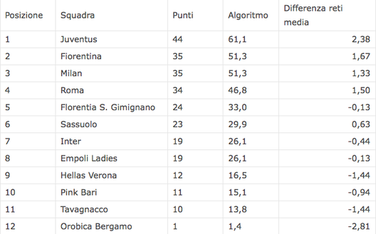 Per la graduatoria si adottano gli stessi criteri correttivi validi per i campionati professionistici maschili, quindi senza assegnazione del titolo alla Juventus, attualmente prima in classifica, mentre la Fiorentina, seconda, andrà in Champions grazie all’algoritmo.