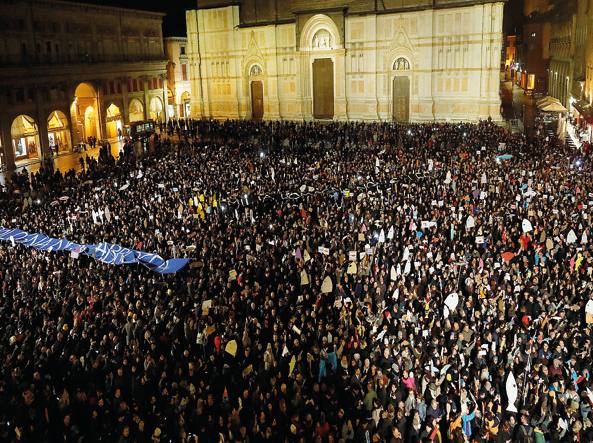 Le piazze tornano a riempirsi. Bologna, Piazza Grande: 15 mila sardine