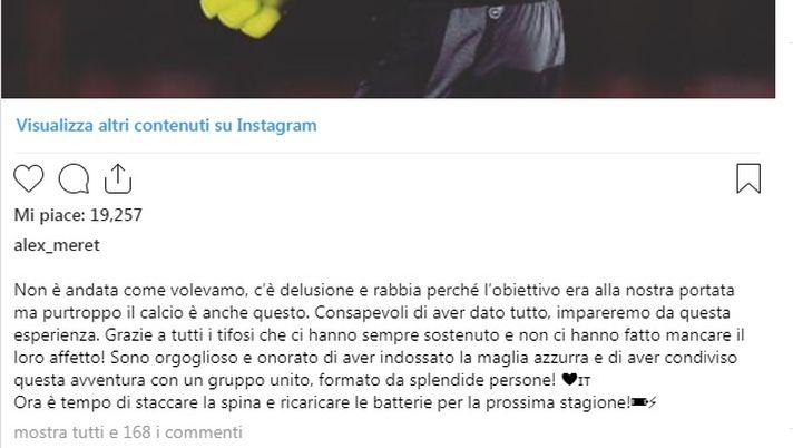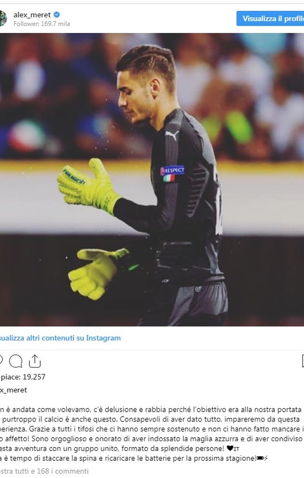 Alex Meret, il portiere friulano estremo difensore dell'Italia U21 tra le favorite alla vittoria finale, ha voluto mandare un messaggio su Instagram ai tifosi azzurri dopo la clamorosa eliminazione dall'Europeo di categoria