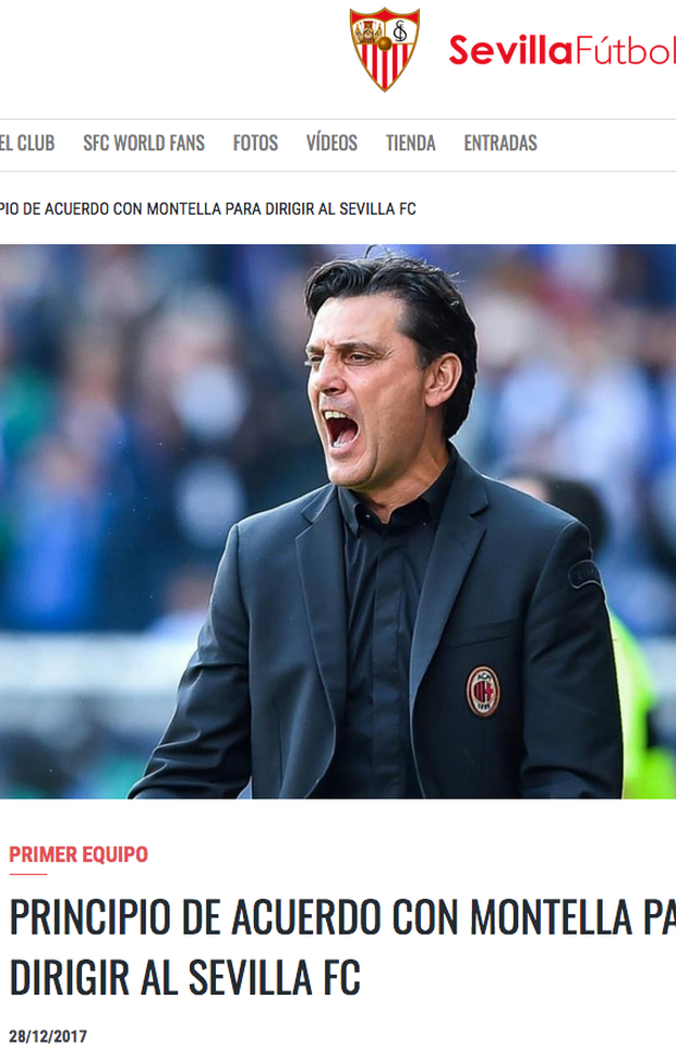 Ad annunciarlo è stato nel pomeriggio lo stesso club andaluso attraverso una nota sul proprio sito ufficiale: "Il Sevilla Fc - si legge - e l'allenatore italiano Vincenzo Montella hanno raggiunto un accordo di massima affinché diventi allenatore della prima squadra fino al giugno 2019. L'accordo verrà formalizzato quando gli avvocati di Montella raggiungeranno l'intesa con l'Ac Milan per la risoluzione del contratto attesa per domani. Una volta liberato, Montella si recherà a Siviglia nella serata di domani per firmare il suo contratto. Sabato mattina dirigerà il primo allenamento e in seguito sarà presentato alla stampa".