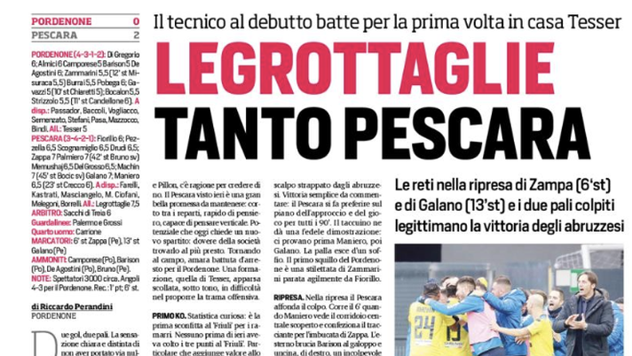 Due gol, due pali. La sensazione chiara e distinta di non aver portato via nulla. Colpo grosso a Pordenone. Il Pescara affossa a domicilio la seconda della classe. Tre punti pulitissimi, figli di una prestazione giudiziosa, ordinata, intensa, come l'aveva preparata in settimana il nuovo tecnico Nicola Legrottaglie. Profilo su cui oggi pende un legittimo interrogativo: sicuri sia solamente una soluzione tampone? Pur rimanendo sullo sfondo le candidature di Di Biagio e Pillon, c'è ragione per credere di no. Il Pescara visto ieri è una gran bella promessa da mantenere: corto tra i reparti, rapido di pensiero, capace di pensare verticale. Potenziale che oggi chiede un nuovo spartito: dovere della società trovarlo al più presto. Tornando al campo, amara battuta d'arresto per il Pordenone. Una formazione, quella di Tesser, apparsa scollata, sotto tono, in difficoltà nel proporre la trama offensiva. (...)