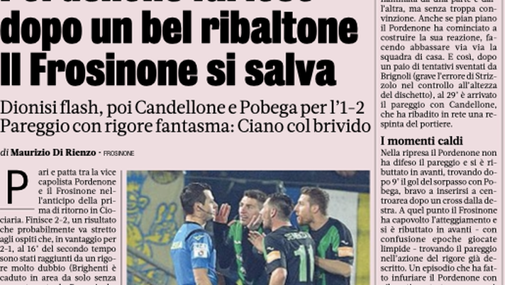 Nella ripresa il Pordenone non ha difeso il pareggio e si è ributtato in avanti, trovando dopo 9’ il gol del sorpasso con Pobega, bravo a inserirsi a centroarea dopo un cross dalla destra. A quel punto il Frosinone ha capovolto l’atteggiamento e si è ributtato in avanti - con confusione epoche giocate limpide - trovando il pareggio nell’azione del rigore già descritto. Un episodio che ha fatto infuriare il Pordenone con vibranti proteste, senza però demoralizzarlo. Tanto è vero che la squadra di Tesser si è ributtata in avanti e a sua volta ha reclamato per un doppio episodio nell’area del Frosinone: prima Tabanelli ha toccato con un braccio un pallone rimbalzato davanti a lui, poi Semenzato è stato trattenuto da tergo da Brighenti. In entrambi i casi Pezzuto ha lasciato correre, e forse ha fatto bene, ma di sicuro ha usato un metro diverso rispetto a quello utilizzato in occasione del rigore per il Frosinone. E tra le proteste il 2-2 è andato in porto.