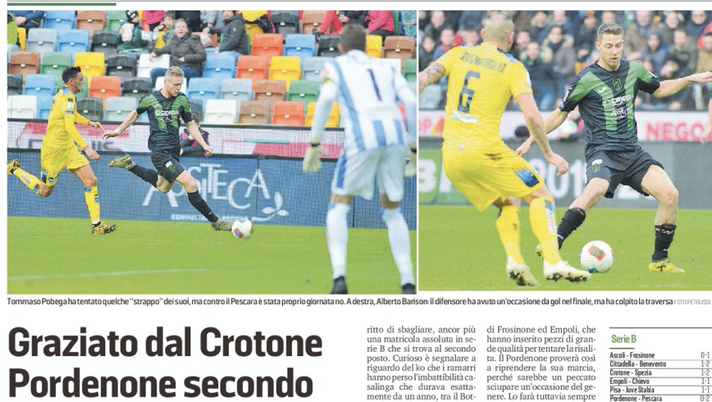 Messaggero Veneto: Graziato dal Crotone Pordenone secondo ma per rimanere lassù deve tornare a correre