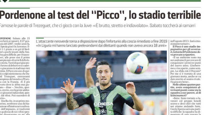 Sabato alle 15 toccherà ai ramarri. Il 27 gennaio del 2007, tredici anni fa, a Spezia giocò la Juventus: finì 1-1 grazie a un gol di Nedved a pochi istanti dalla fine. Una gara difficile, per i bianconeri, alle prese con il primo campionato di serie B della loro storia. Tanti di quei giocatori furono al debutto tra i cadetti e giocarono in stadi mai visti prima. Il Picco era uno di questi e colpì nientemeno che David Trezeguet, centravanti campione del mondo e d'Europa con la Francia. «È il più brutto dove io abbia mai giocato - disse -. Vecchio, sporco, stretto, con la gente addosso e giocatori indiavolati, spinti dai tifosi. Può succedere di tutto».Quella che, in un primo momento, sembrava una dichiarazione offensiva nei confronti dell'impianto, si trasformò in qualcosa di cui i tifosi spezzini diventarono un po' alla volta molto orgogliosi: rappresentava fedelmente le difficoltà che tanti calciatori incontrano quando giocano a Spezia, con il pubblico, caloroso, a ridosso del campo, che si fa sentire più che in altre parti.Da allora le frasi di Trezeguet vengono riportate costantemente nella narrazione dello stadio, che ospita da 101 anni le gare casalinghe dei bianconeri. Particolarmente calda la curva Ferrovia, un bel test sabato per il Pordenone che sarà a Spezia per la prima volta nella sua storia recente e per la terza volta in Liguria nel giro di pochi mesi (...)