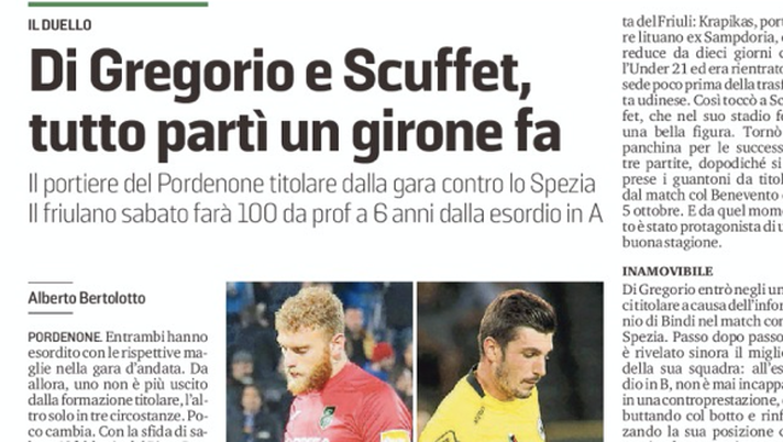 Entrambi hanno esordito con le rispettive maglie nella gara d'andata. Da allora, uno non è più uscito dalla formazione titolare, l'altro solo in tre circostanze. Poco cambia. Con la sfida di sabato 1° febbraio del Picco Pordenone e Spezia, Michele Di Gregorio e il friulano Simone Scuffet festeggeranno un girone a difesa dei pali delle proprie squadre. Una sfida nella sfida, tra due portieri di 22 e 23 anni. Curiosità vuole che Scuffet, al cospetto de i ramarri, festeggerà la sua 100ª presenza tra i professionisti quando ricorrerà il sesto anniversario dall'esordio in A con l'Udinese.RICORRENZAEra il 1° febbraio del 2014: Guidolin schierò il 17enne della Primavera in seguito all'infortunio del serbo Brkic. Da allora ne ha fatta di strada, Scuffet, passando dal rifiuto all'Atletico Madrid nel corso dell'estate dello stesso anno per arrivare alla porta dello Spezia dopo aver giocato con il Como, nuovamente con l'Udinese e con i turchi dello Kasimpasa.Al Picco, col Pordenone, farà 100, consapevole di aver trovato serenità e continuità di prestazioni vestendo la maglia bianconera. Il tecnico, Vincenzo Italiano, gli diede fiducia per la prima volta in stagione nella sfida d'andata del Friuli: Krapikas, portiere lituano ex Sampdoria, era reduce da dieci giorni con l'Under 21 ed era rientrato in sede poco prima della trasferta udinese. Così toccò a Scuffet, che nel suo stadio fece una bella figura. Tornò in panchina per le successive tre partite, dopodiché si riprese i guantoni da titolari dal match col Benevento del 5 ottobre. E da quel momento è stato protagonista di una buona stagione.(...)
