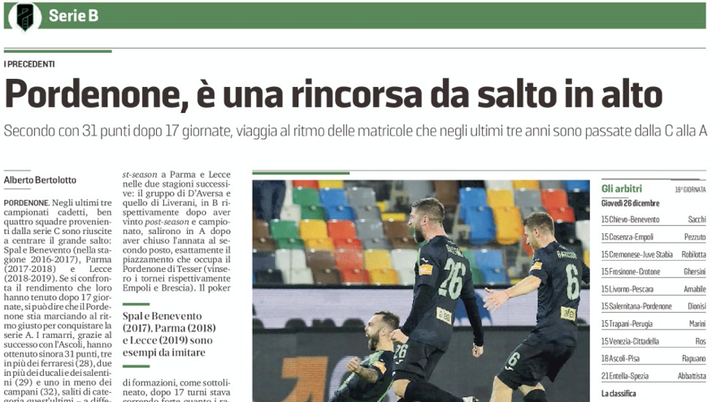 Negli ultimi tre campionati cadetti, ben quattro squadre provenienti dalla serie C sono riuscite a centrare il grande salto: Spal e Benevento (nella stagione 2016-2017), Parma (2017-2018) e Lecce (2018-2019). Se si confronta il rendimento che loro hanno tenuto dopo 17 giornate, si può dire che il Pordenone stia marciando al ritmo giusto per conquistare la serie A. I ramarri, grazie al successo con l'Ascoli, hanno ottenuto sinora 31 punti, tre in più dei ferraresi (28), due in più dei ducali e dei salentini (29) e uno in meno dei campani (32), saliti di categoria quest'ultimi - a differenza delle altre - tramite il trampolino dei play-off.PASSO PERFETTOIl campionato non è neppure a metà: col Boxing day si è solamente alla penultima giornata del girone d'andata, che può essere significativa per il Pordenone visto che può confermare aritmeticamente al secondo posto. Si può dire intanto che i neroverdi siano a buon punto sulla strada che porta al grande sogno, a quella serie A che sino a pochi mesi fa sembrava una parola impronunciabile. A dare sostegno a questa tesi le statistiche degli ultimi campionati, in cui almeno una matricola è salita: Spal e Benevento, nel 2015-2016, avevano vinto il torneo di serie C (rispettivamente il girone B e C) e la stagione successiva sono state subito protagoniste in B, campionato al tempo che si sviluppava ancora su 42 turni.