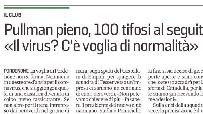 "La voglia di Pordenone non si ferma. Nemmeno in queste ore d'ansia per il coronavirus, che si aggiunge a quella di una classifica divenuta di colpo meno rassicurante. Se non altro per il trend intrapreso dai neroverdi nel girone di ritorno, in cui hanno conquistato appena 2 punti in 6 partite. Ma la passione va oltre. Così il pullman organizzato dal neonato fan clun "Pn Neroverde 2020" è stato riempito. E domani, sugli spalti del Castellani di Empoli, per spingere la squadra di Tesser verso un'impresa ci saranno un centinaio di cuori neroverdi.