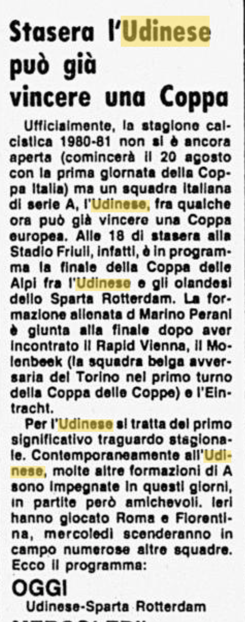 L'Udinese può vincere il primo trofeo europeo, a Rotterdam per la Coppa delle Alpi