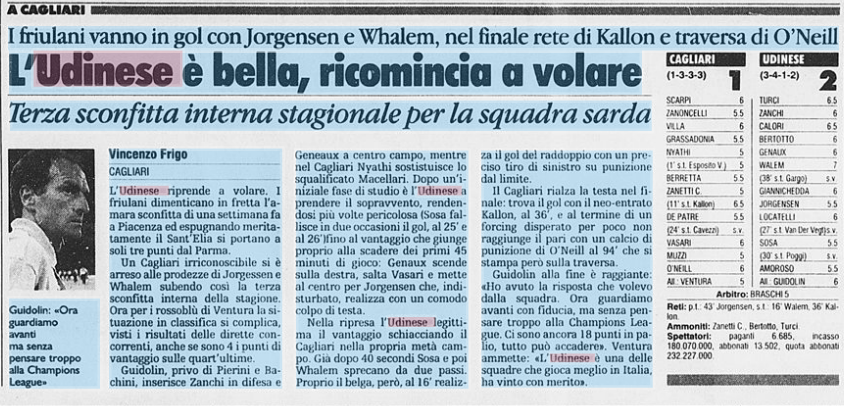 L'Udinese di Guidolin espugna Cagliari per 2-1, squadra bella che ora torna a vedere l'Europa. E' il 10 aprile 1999