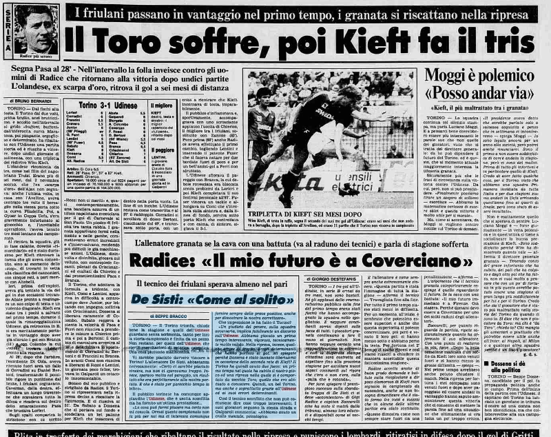 Pasa illude l'Udinese di De Sisti, poi il ritorno del Torino che con Kieft ne fa tre. E' il 10 maggio 1987