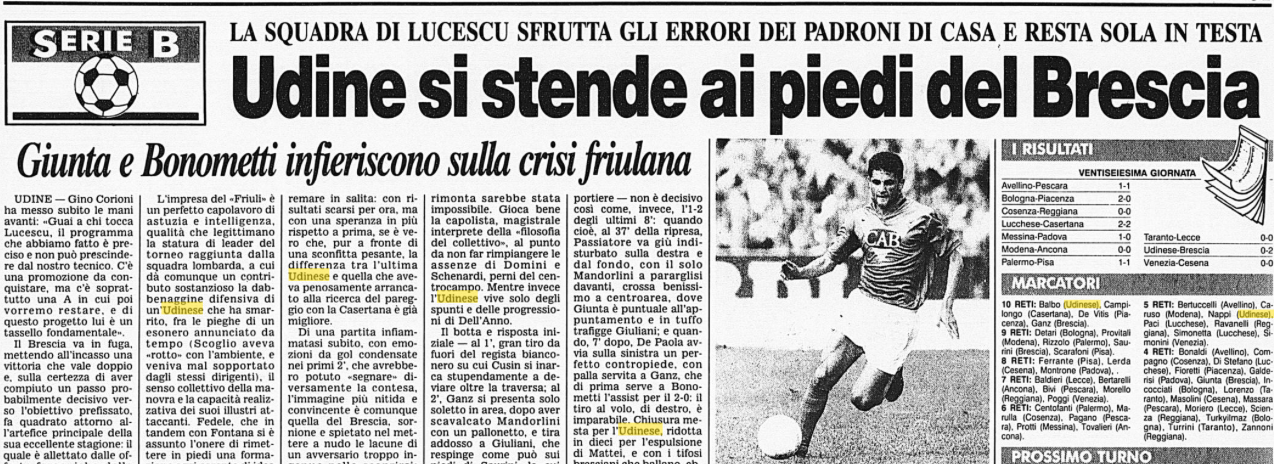 Il 12 marzo 1992 è una data da cancellare per l'Udinese che perde col Brescia rimane sesta in serie B come racconta il Corsera.