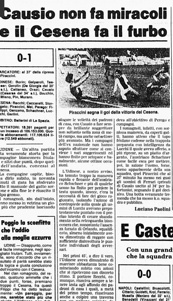 L'Udinese perde in casa col Cesena, Causio non basta questa volta. E' il 12 febbraio 1982