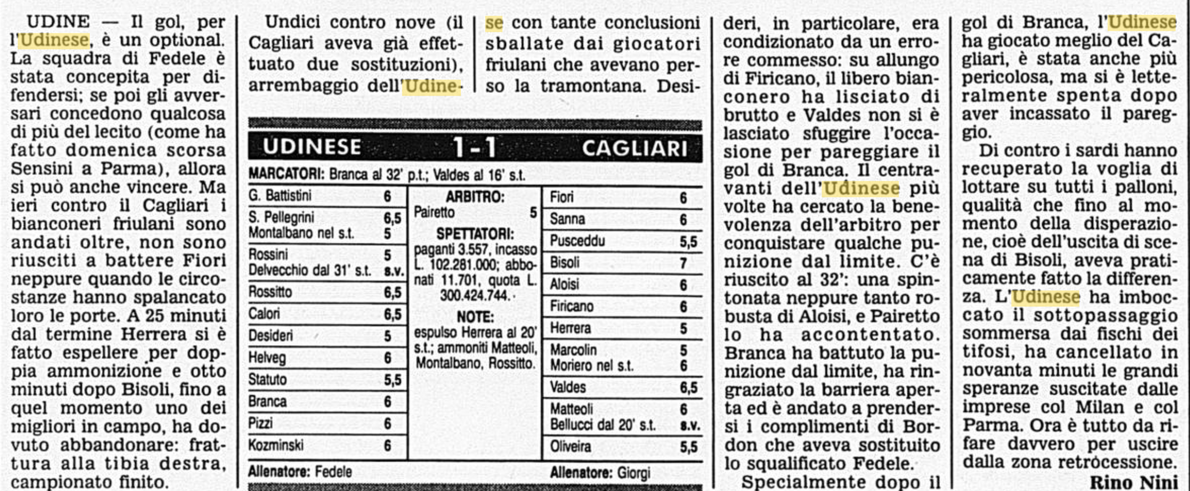 L'Udinese grazia il Cagliari ridotto in nove e pareggia 1-1: è il 14 gennaio 1994