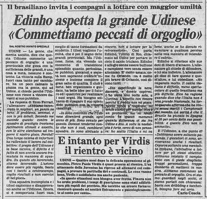 Edinho carica l'Udinese, la vuole più umile e ambiziosa. E' il 16 gennaio 1982.