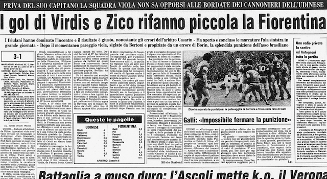 L'Udinese con Zico e Virdis fa piccola la Fiorentina. Punizione imparabile del Galinho. E' il 16 febbraio 2984
