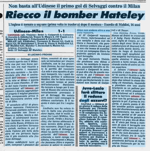 L'Udinese pareggia col Milan Selvaggi e Hatley in gol. E' il 17 gennaio 1985
