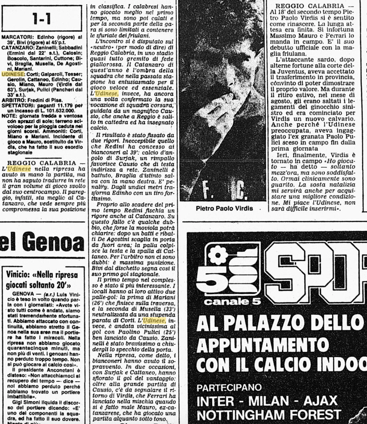 Solo 1-1 dell'Udinese col Catanzaro a reggio Calabria, ma i friulani recuperano Virdis