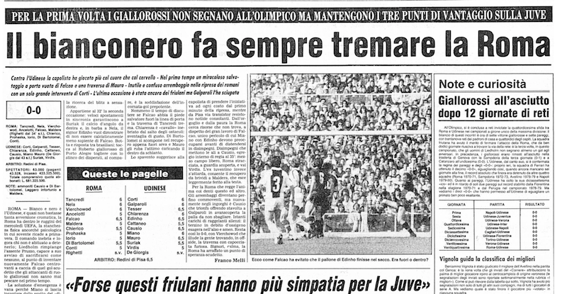 L'Udinese blocca la Roma all'Olimpico sullo 0-0, per la prima volta i giallorossi non segnano. E' il 19 marzo 1983