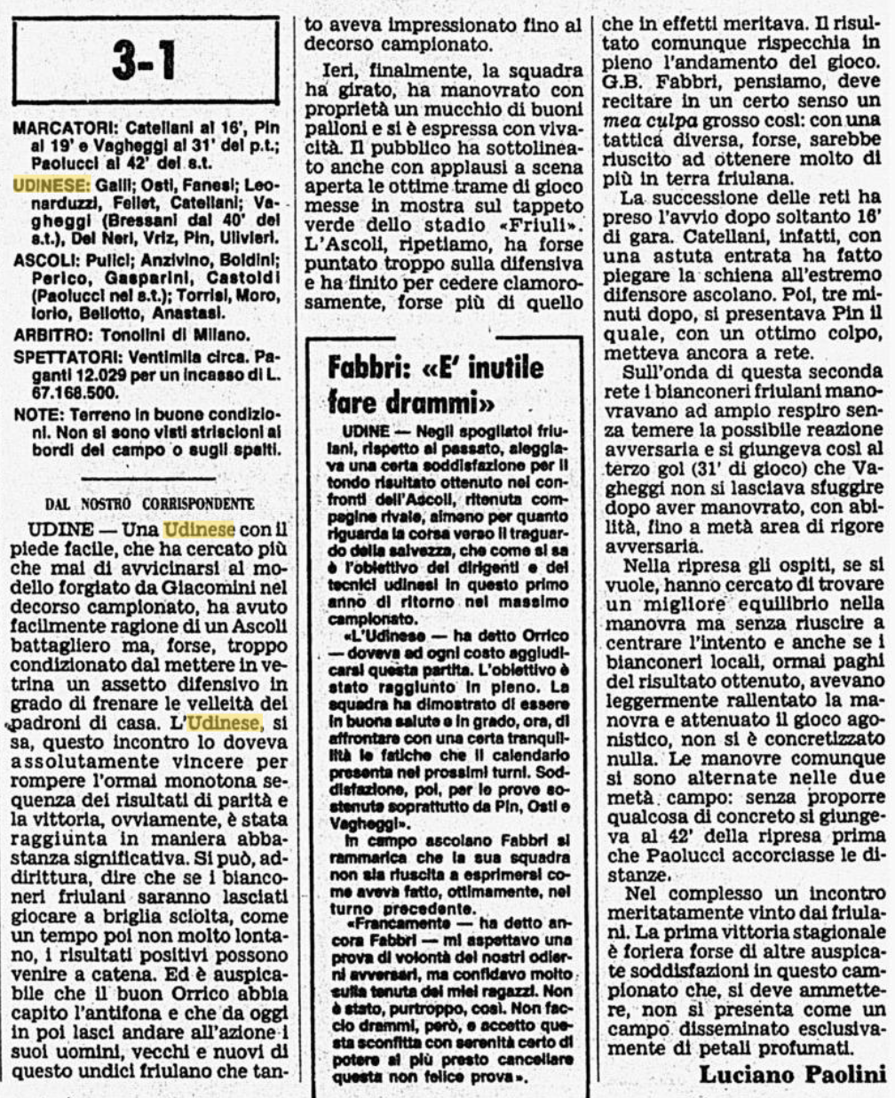 Udinese a valanga contro l'Ascoli come quando dominava in B: è+ il 2 novembre 1979