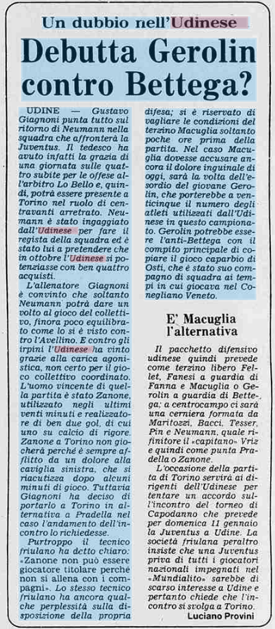 L'Udinese pensa di far debuttare il giovane Manuel Gerolin. E' sabato 20 dicembre 1980.
