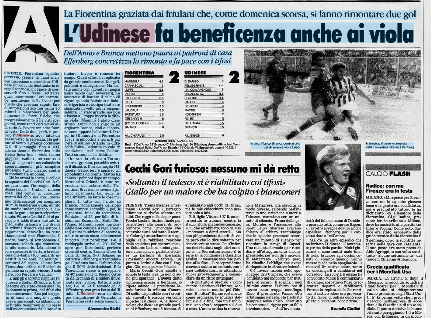 L'Udinese si fa rimontare a Firenze. Non bastano Dell'Anno e Branca, è il 20 maggio 1993