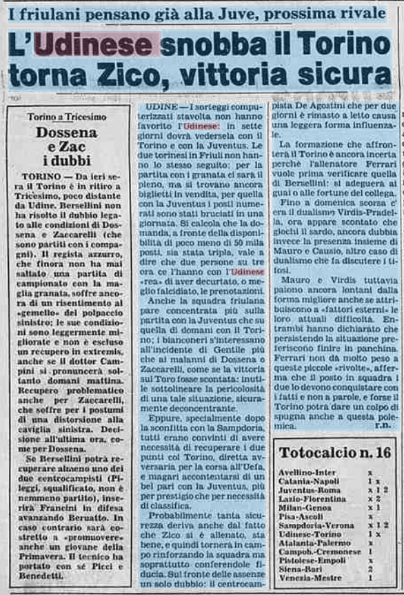 L'Udinese snobba il Torino e pensa già alla Juve. Torna Zico, è il 2 dicembre 1983.
