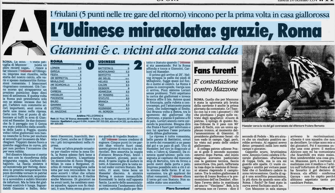 L'Udinese batte la Roma e conquista 5 punti nelle tre gare del ritorno tornando a sperare: è il 22 gennaio 1994