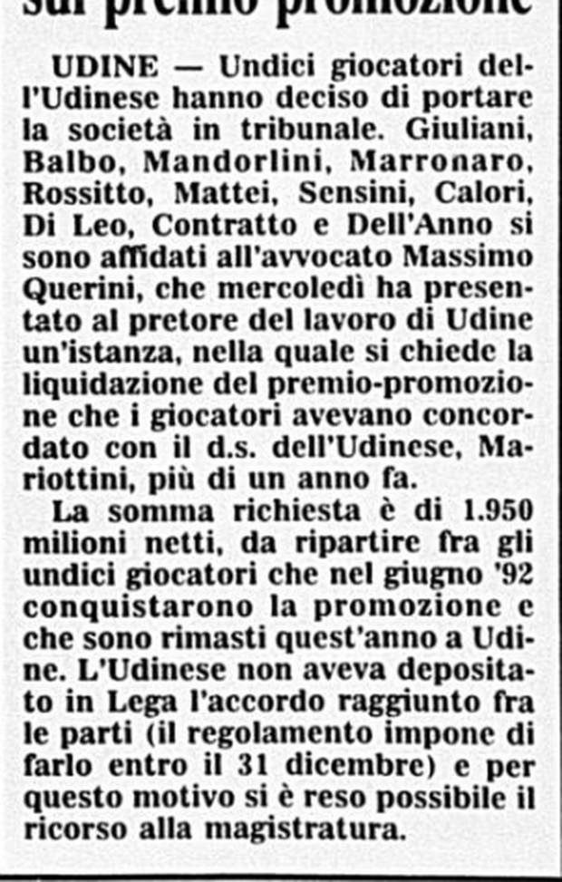 I giocatori dell'Udinese fanno causa alla società sul premio promozione: è il 2 marzo 1993