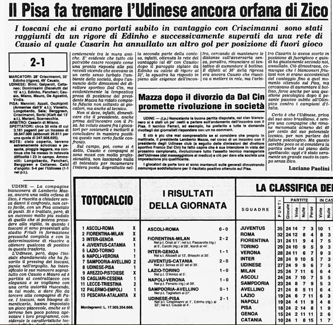 L'Udinese vince a fatica sul Pisa: organi di Zico i bianconeri soffrono i toscani. Alla fine è 2-1. E' il 23 marzo 2984