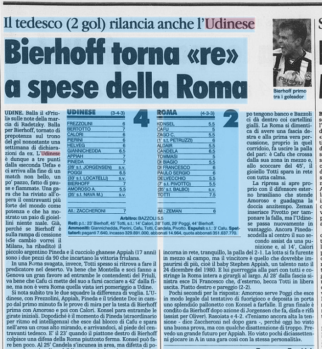 Bierhoff con due reti rilancia anche l'Udinese che batte 4-2 la Roma. E' il 23 aprile 1998
