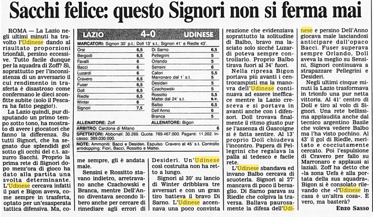 La Lazio travolge l'Udinese all'olimpico il 25 marzo 1993. l'Udinese di Bigon continua a mostrare falle in trasferta, come racconta il Corsera