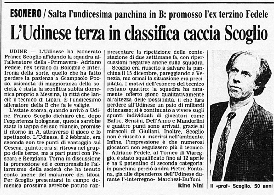 Sconfitta amara col 'suo' Messina per Franco Scoglio: l'Udinese decide di esonerarlo. E' il 24 febbraio 1992