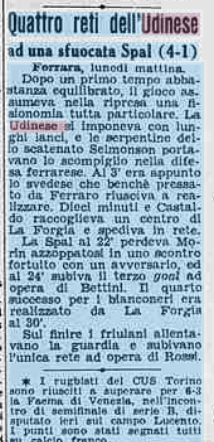 L'Udinese continua a vincere ed è la più seria candidata a dare fastidio al Milan per lo scudetto: 4-0 anche alla Spal. E' il 2 aprile 1955
