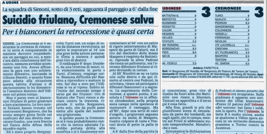 In vantaggio di tre gol, l'Udinese si fa rimontare dalla Cremonese perdendo il treno salvezza: è il 24 aprile 1994