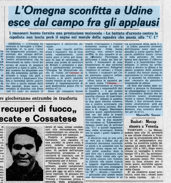 L'Udinese che punta alla C1 vince a fatica con l'Omegna che esce tra gli applausi dal 'Friuli'. E' il 25 aprile 1978