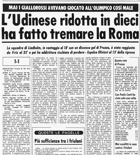 Vriz agguanta il gol della Roma siglato con Pruzzo. L'Udinese in die fa tremare l'Olimpico. E' il 26 febbraio 1980