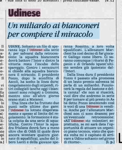 Pozzo stanzia un miliardo di lire (500 mln di Euro) per la salvezza dell'Udinese da conquistare all'ultima giornata. E' il 26 aprile 1990