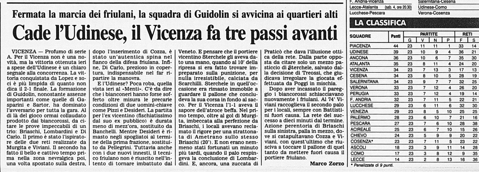 L'Udinese arresta la sua marcia verso la Serie A contro il Vicenza di Guidolin. E' il 27 febbraio 1995