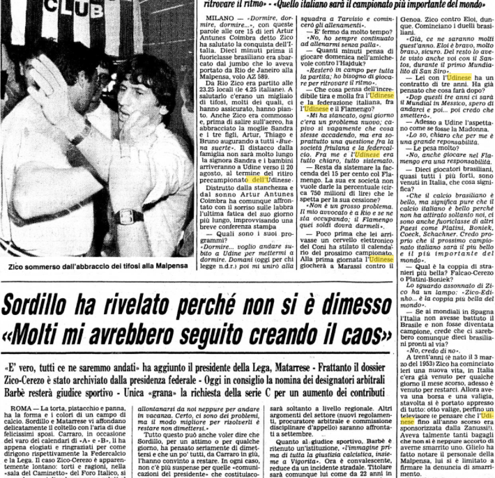 Zico "Io ed Edinho più forti di Falcao e Cerezo" e i tifosi dell'Udinese sognano. E' il 28 luglio 1983 (Corsera)